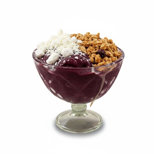 Açaí cremoso, leite condensado, leite em pó e granola.